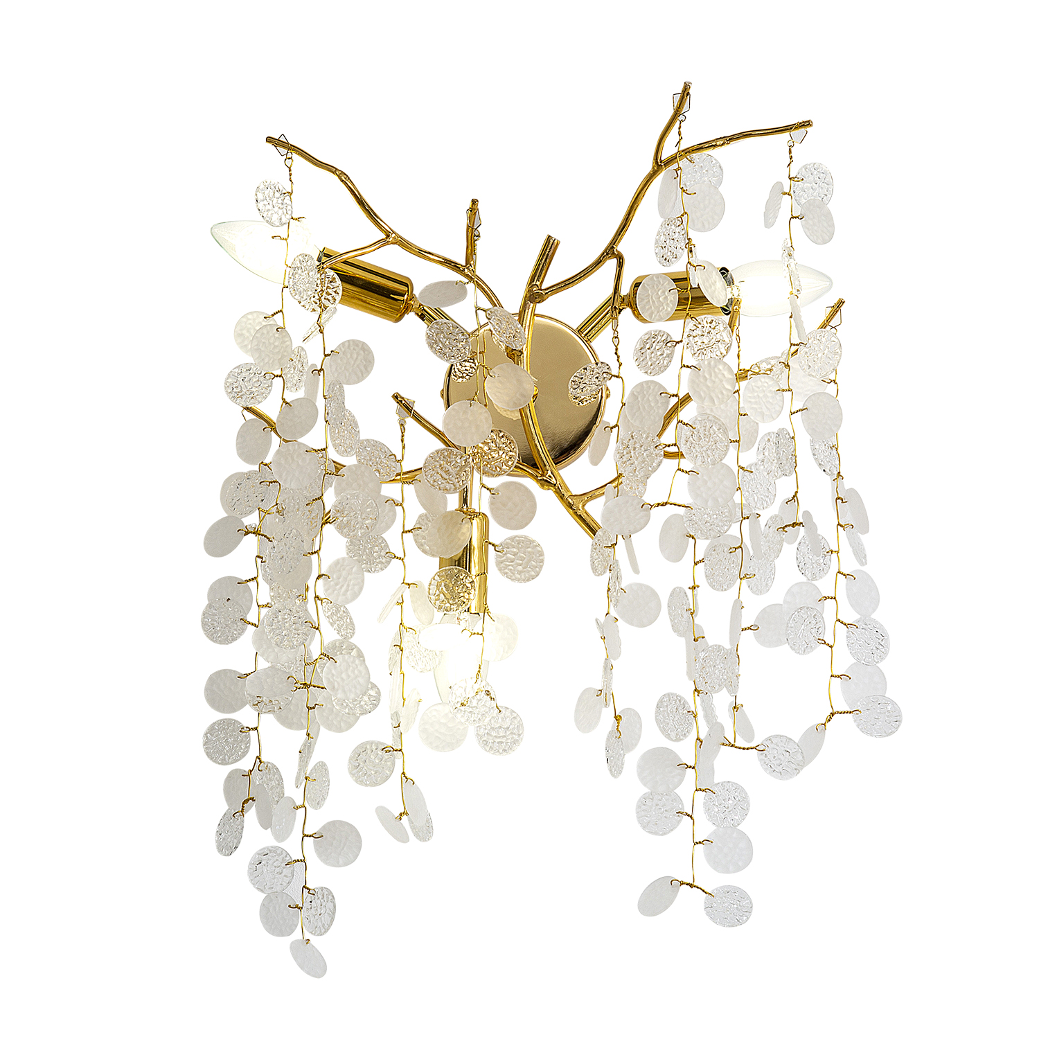 Светильники, стилизованные под ветви деревьев, становятся особенно актуальными в этом сезоне. В нашей коллекции мы представили две люстры овальной формы, что тоже является модным трендом. Каркас светильников покрыт золотом гальваническим способом. Подвески представляют собой нанизанные на тонкие проволочки круглые стекла белого и прозрачного цвета, напоминая свисающие соцветия экзотических растений.