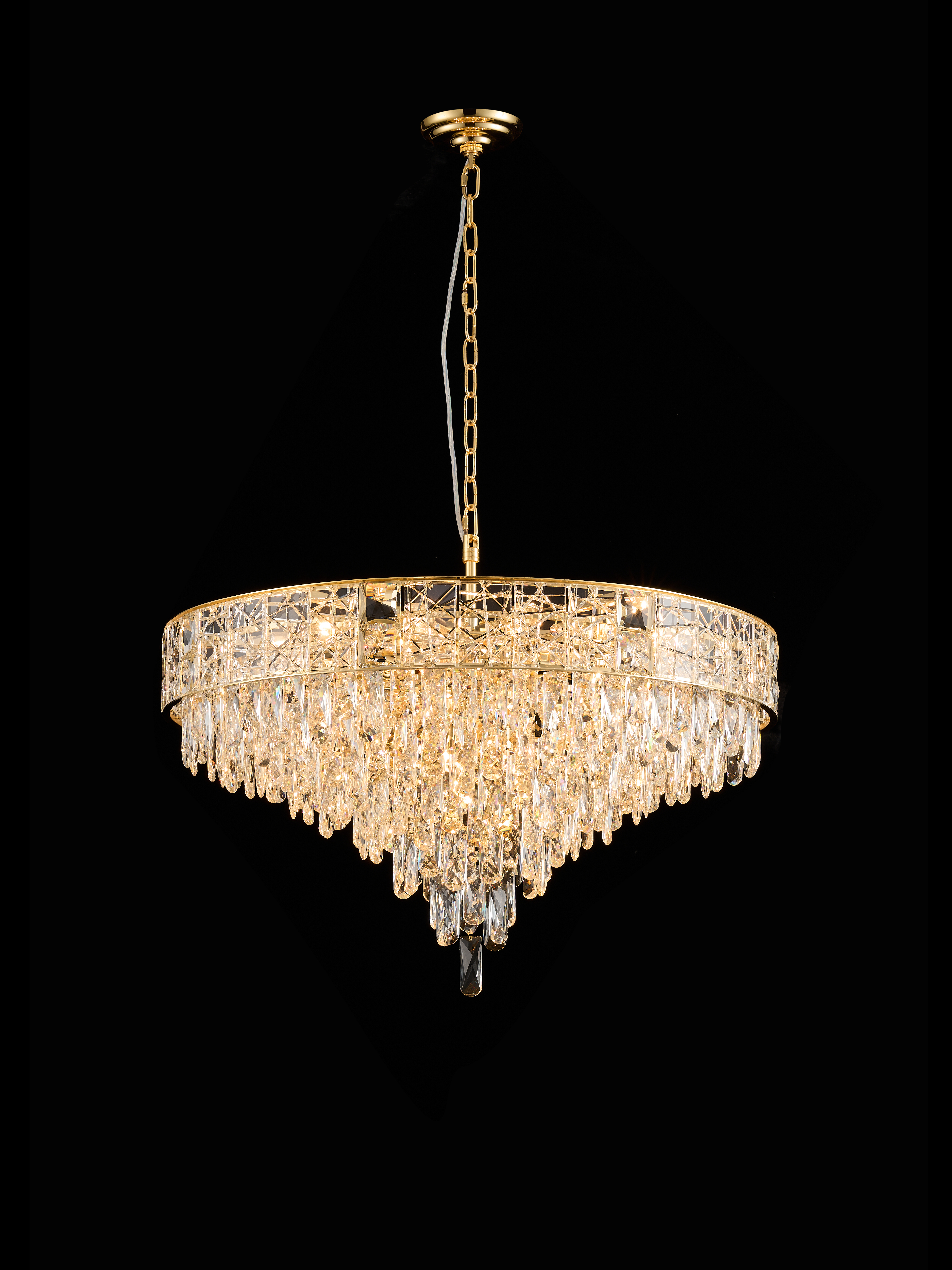 Роскошный дизайн хрустальных люстр и бра Elysium неминуемо будет притягивать к себе взгляды. Каждый элемент этой коллекции тщательно продуман, чтобы создать атмосферу изысканности и элегантности: золотой каркас удачно дополнен декоративным ободком из прозрачных стеклянных пластин с геометрическим узором и каскадом из крупного хрусталя изысканной формы. Отражая свет, он создаёт волшебные блики, играет с тенями и обретает свой завораживающий вид.