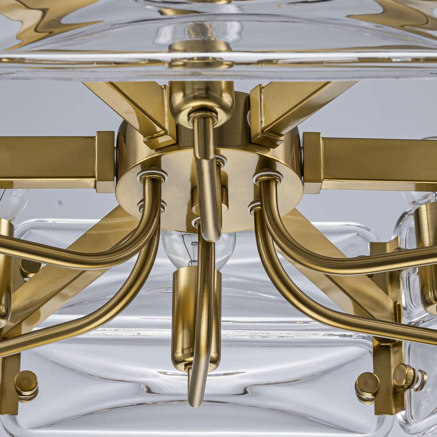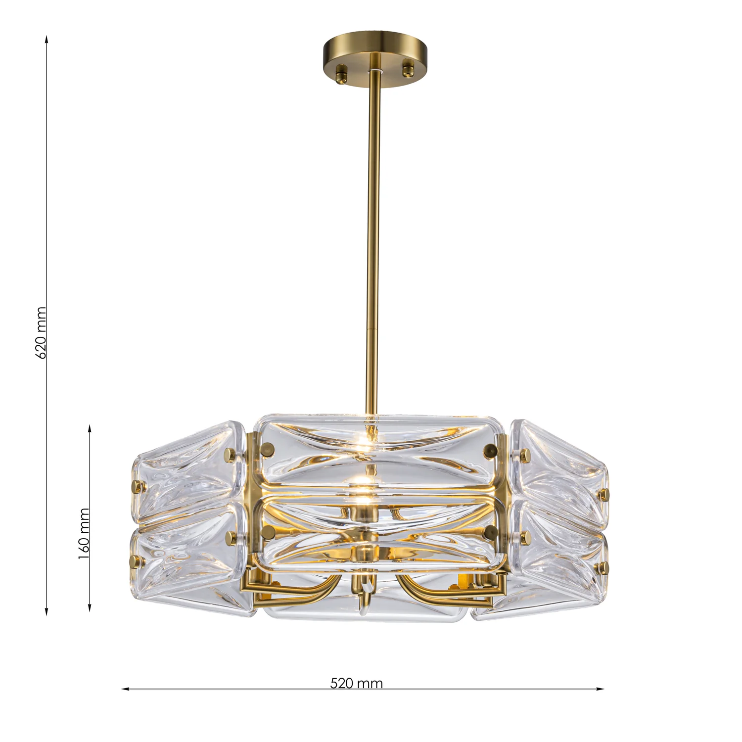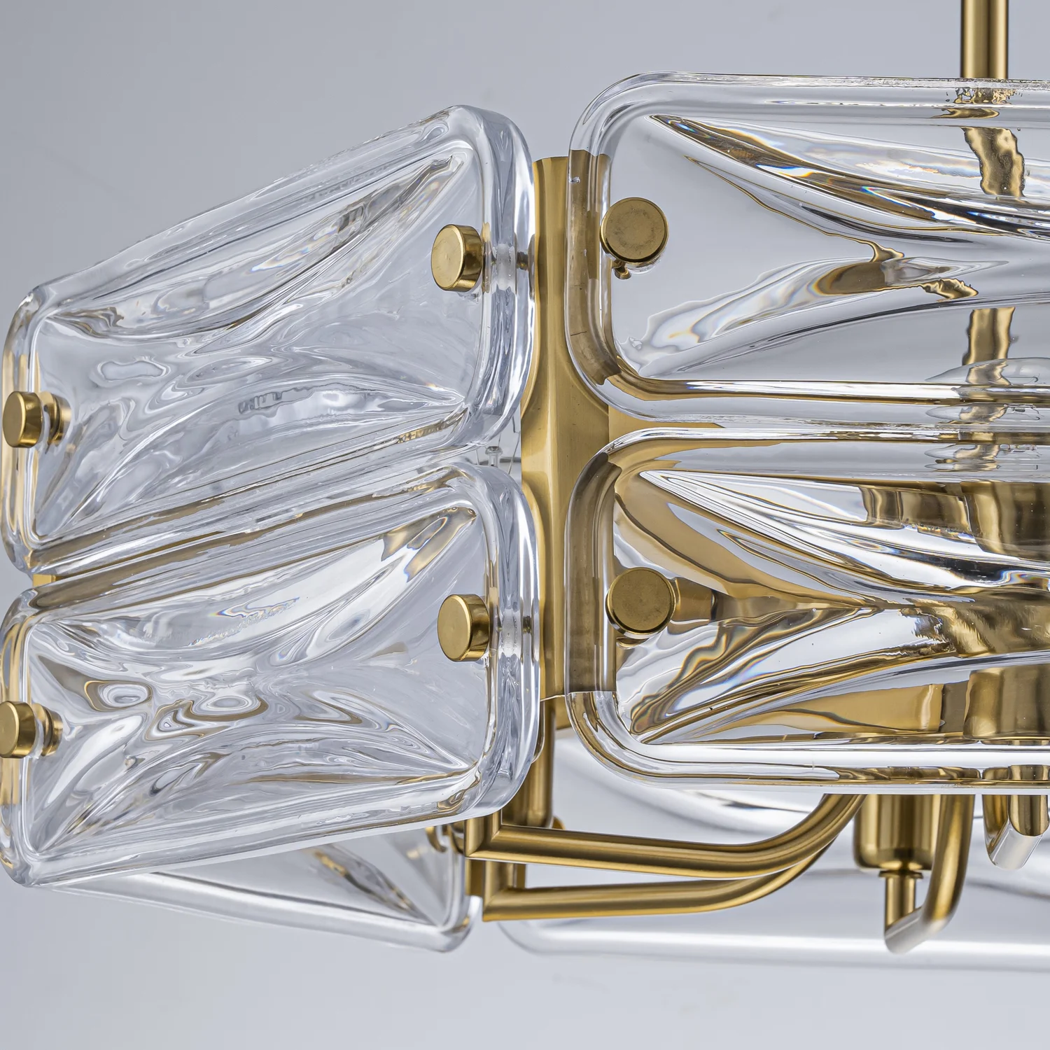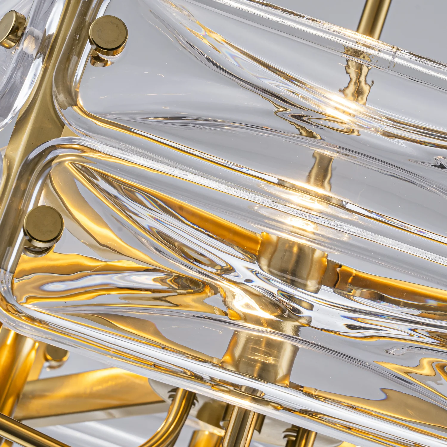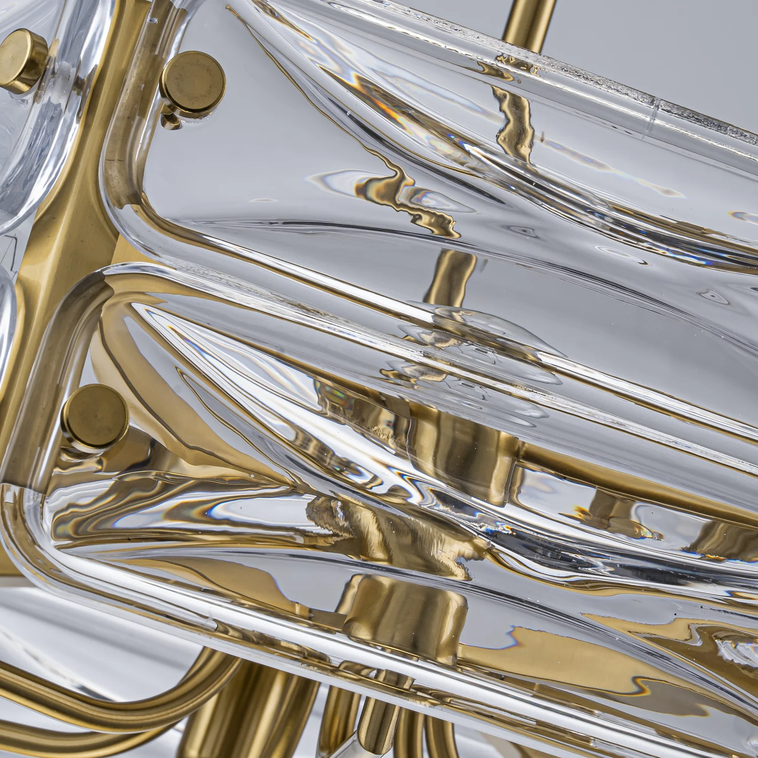 Светильники коллекции Glacies созданы, чтобы стать важной доминантой вашего интерьера. Люстры на штанге и бра имеют прочное основание из металла с гальваническим покрытием под латунь, украшенное массивными пластинами из прозрачного стекла со скругленными углами, которые, благодаря своей фактуре создают интересный световой эффект.