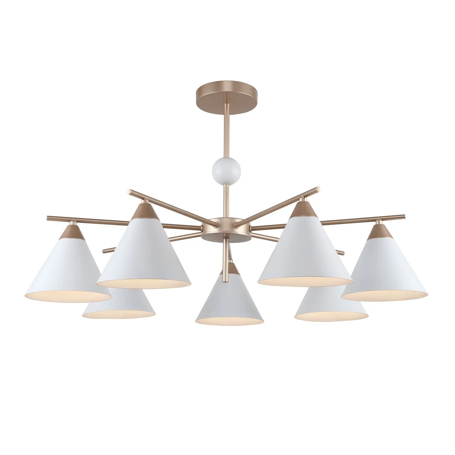 Светильники Calor выполнены в цвете перламутровое золото, металлические плафоны окрашены в белый, декоративный шар украшает центральный шток люстр. Компактная высота позволит использовать люстры в помещениях с невысокими потолками.