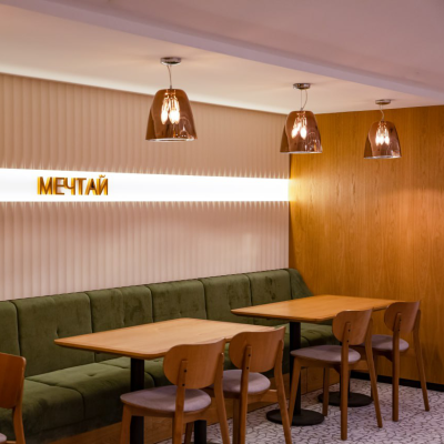Теплые природные оттенки, воздушные элементы декора, золотистые акценты оформления кафе погружают посетителей в атмосферу, способствующую креативному мышлению и новым идеям.