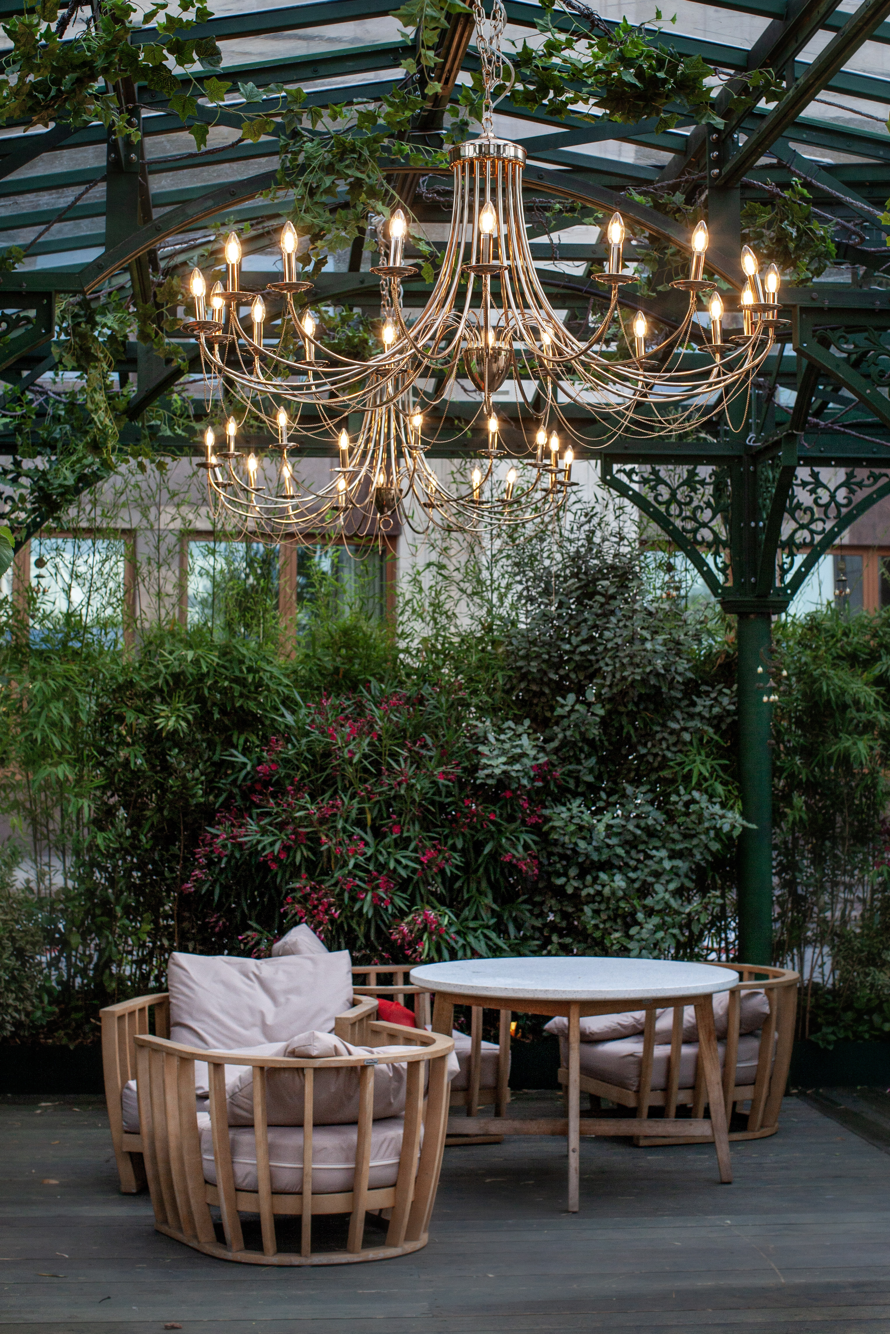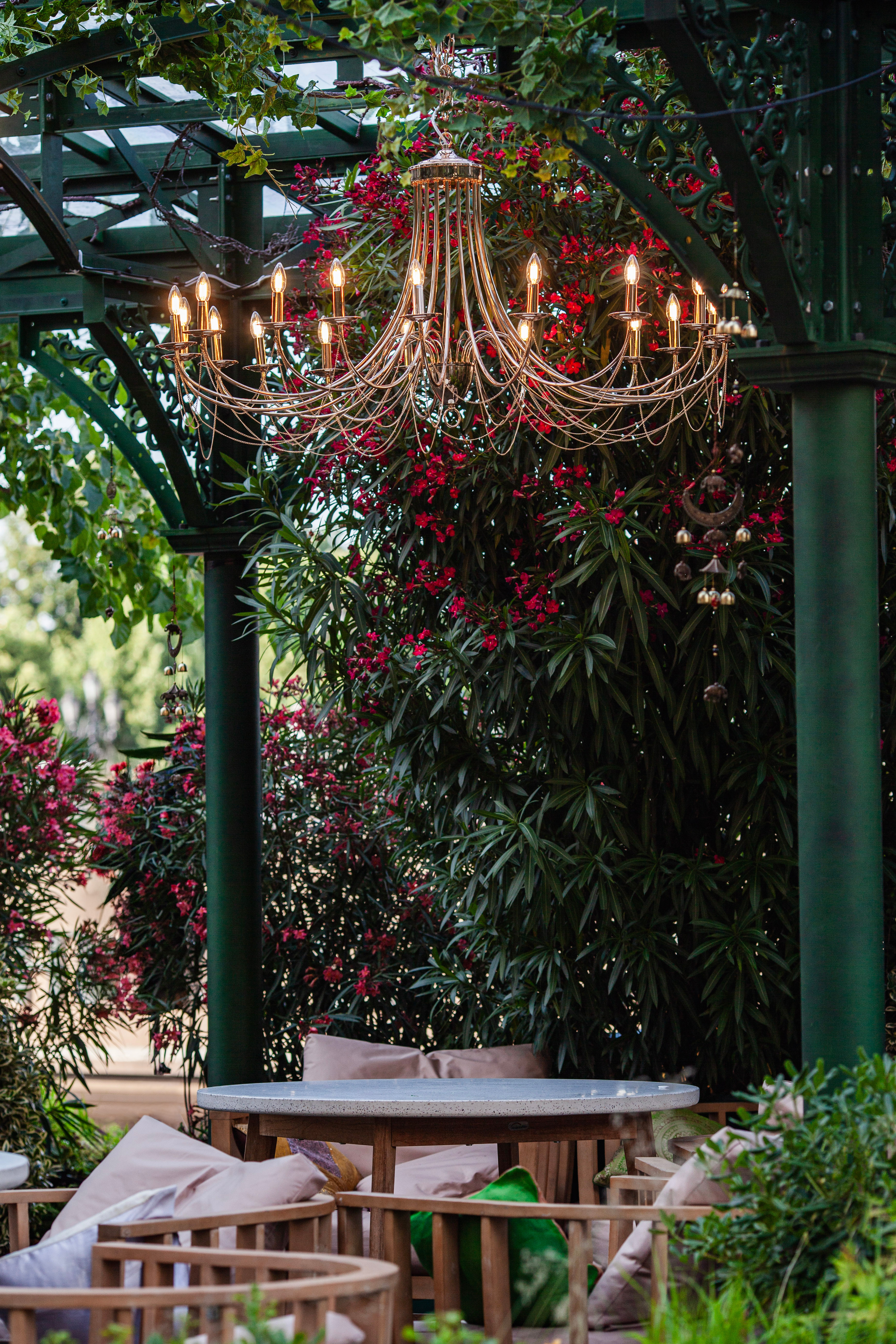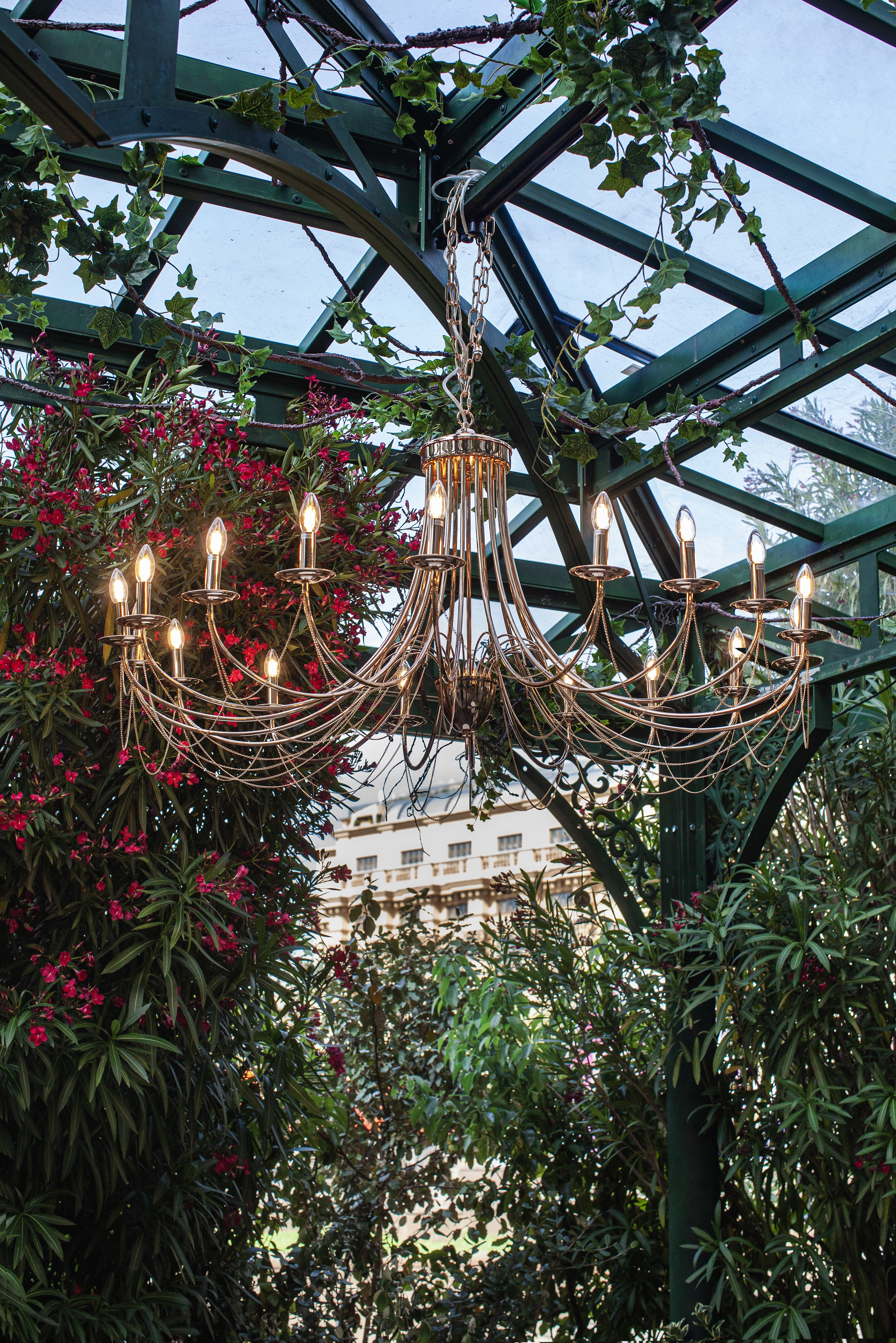 Обрамлённые зеленью и декоративными гирляндами, люстры Plini смотрятся изысканно и торжественно. Металлический блеск, изящные рожки и цепочки добавляют свету архитектурную выразительность, а самому пространству — утончённость и уют.