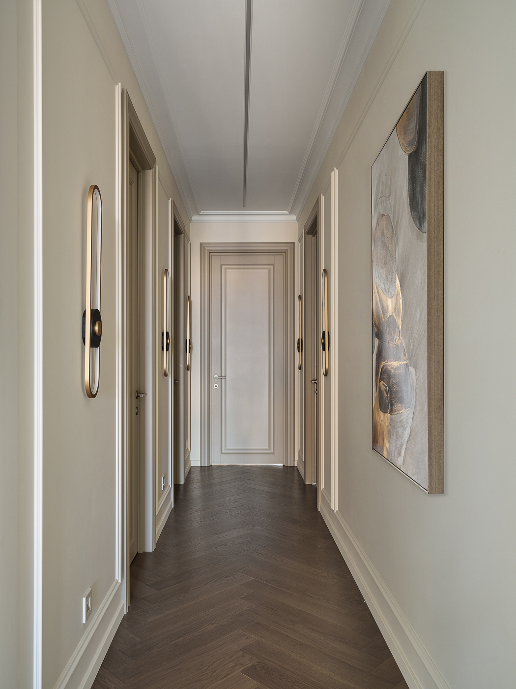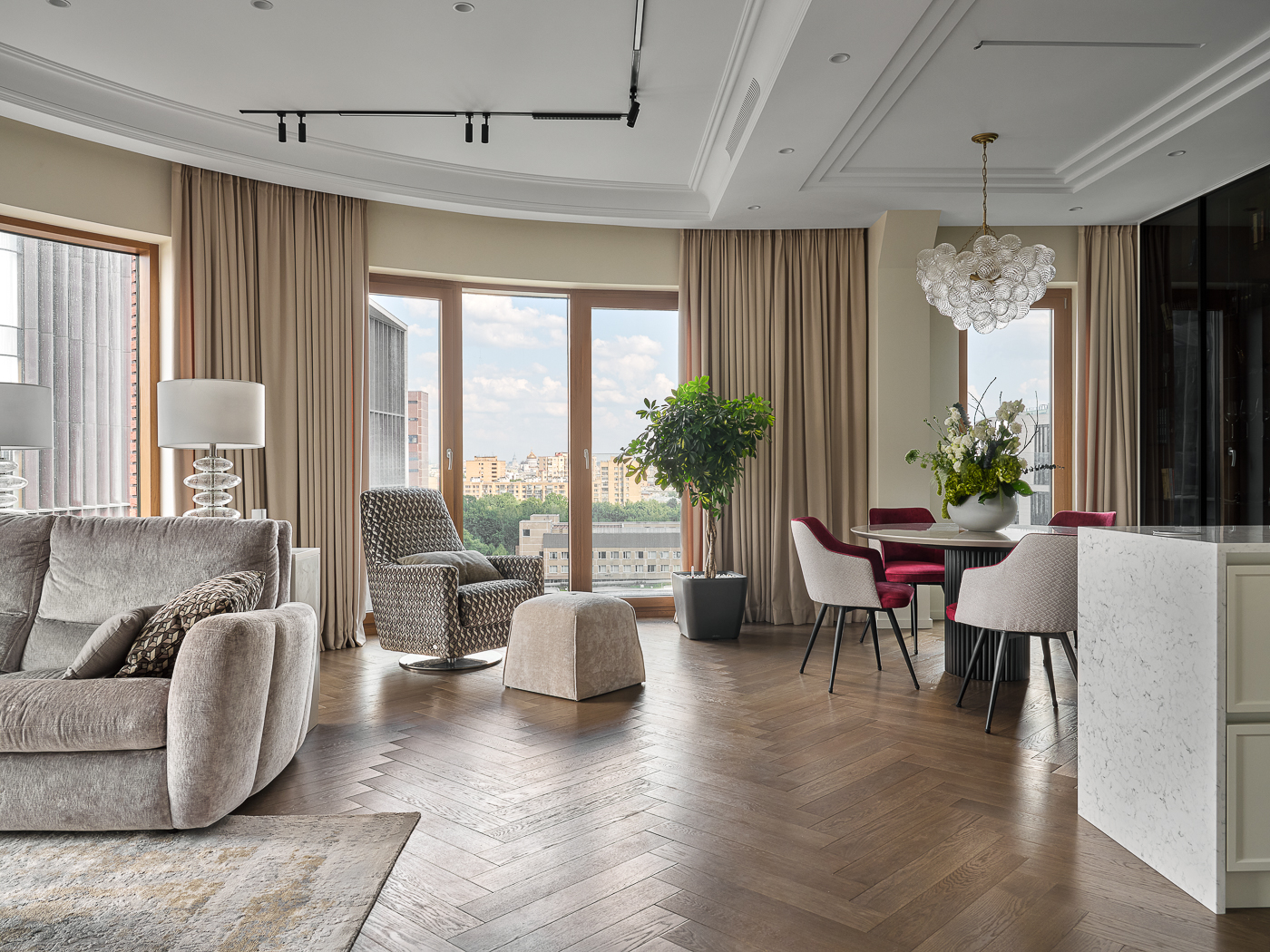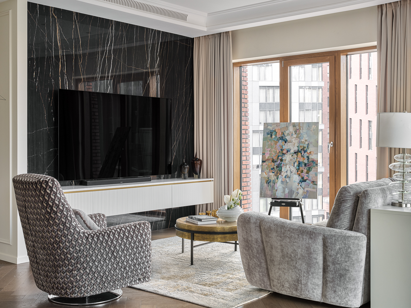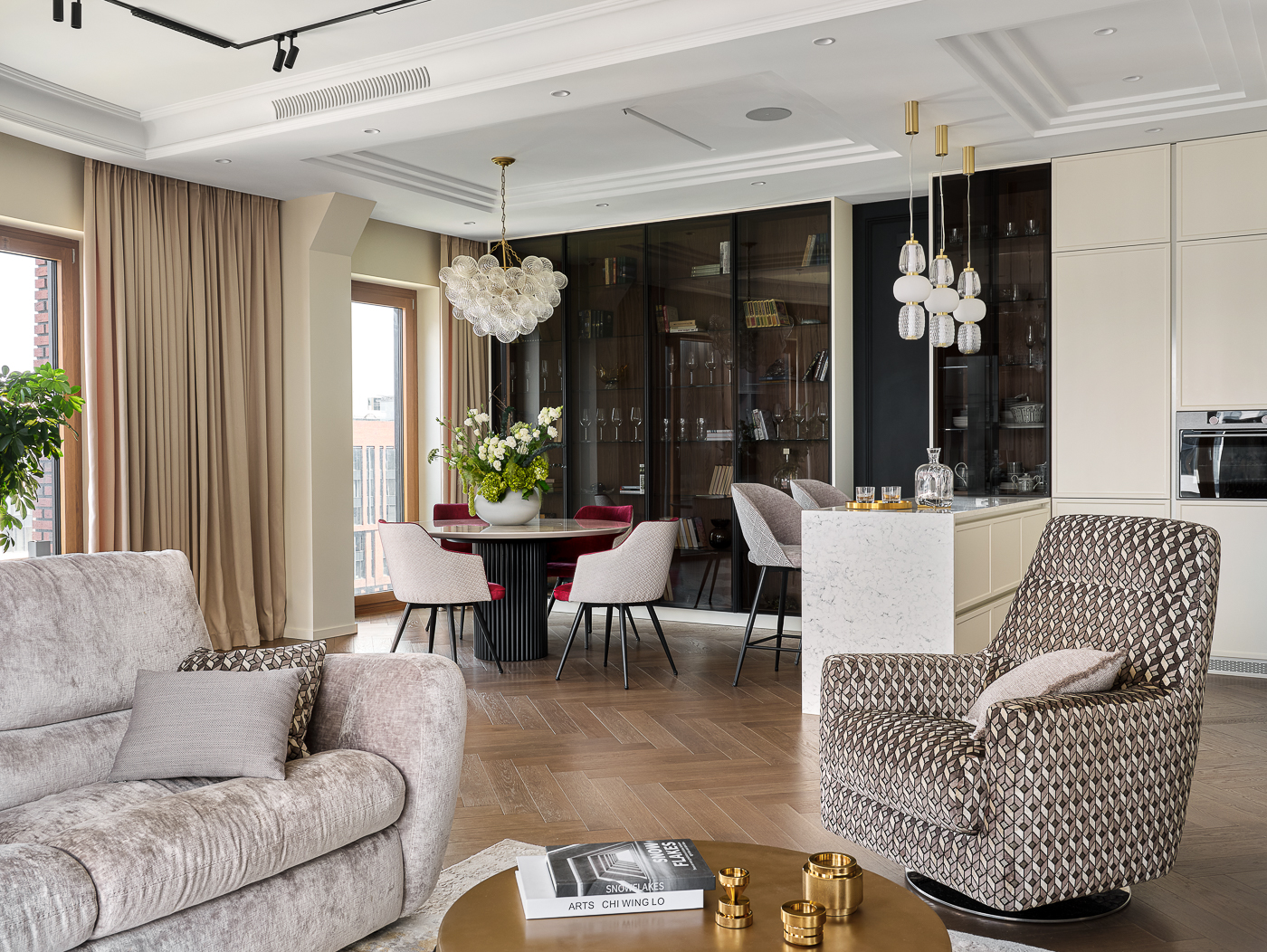 Интерьер получился зрелым и живым — где классика дышит современностью, а свет превращает пространство в эмоцию.
