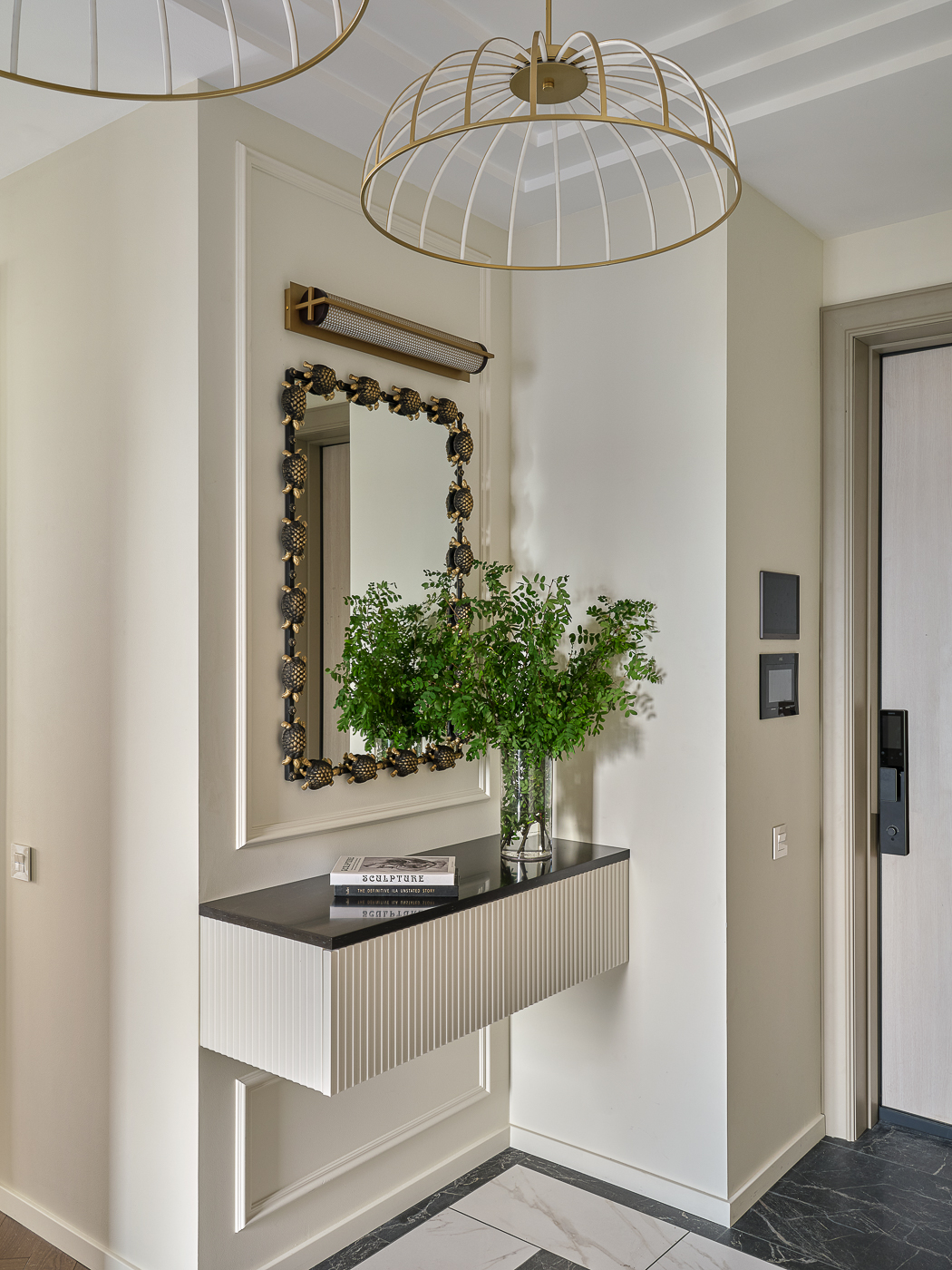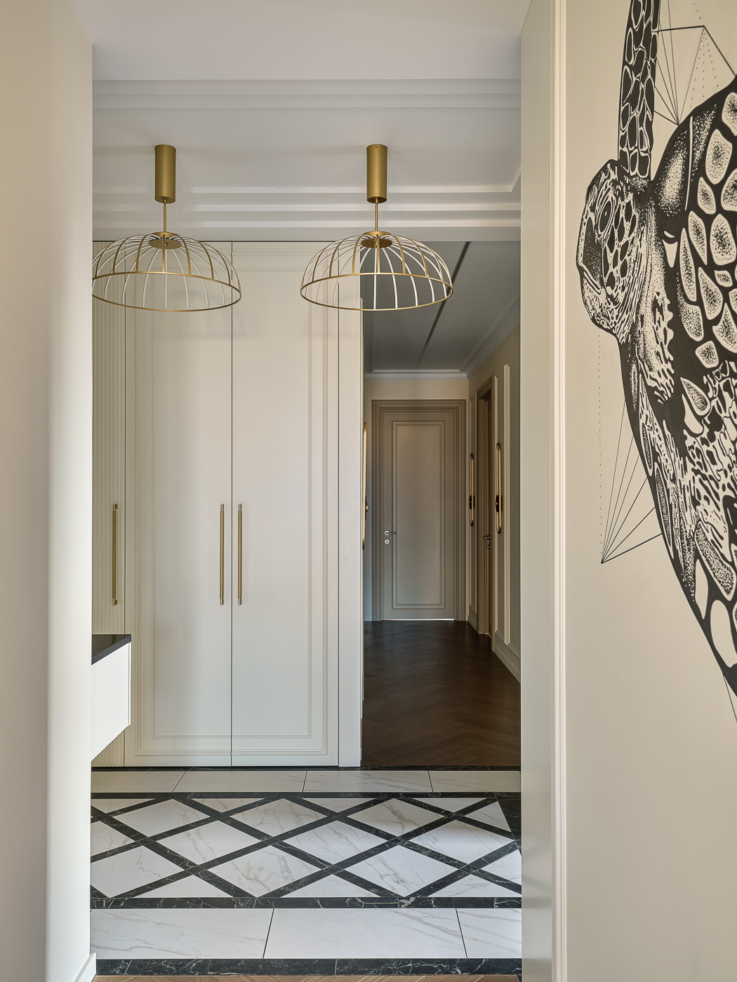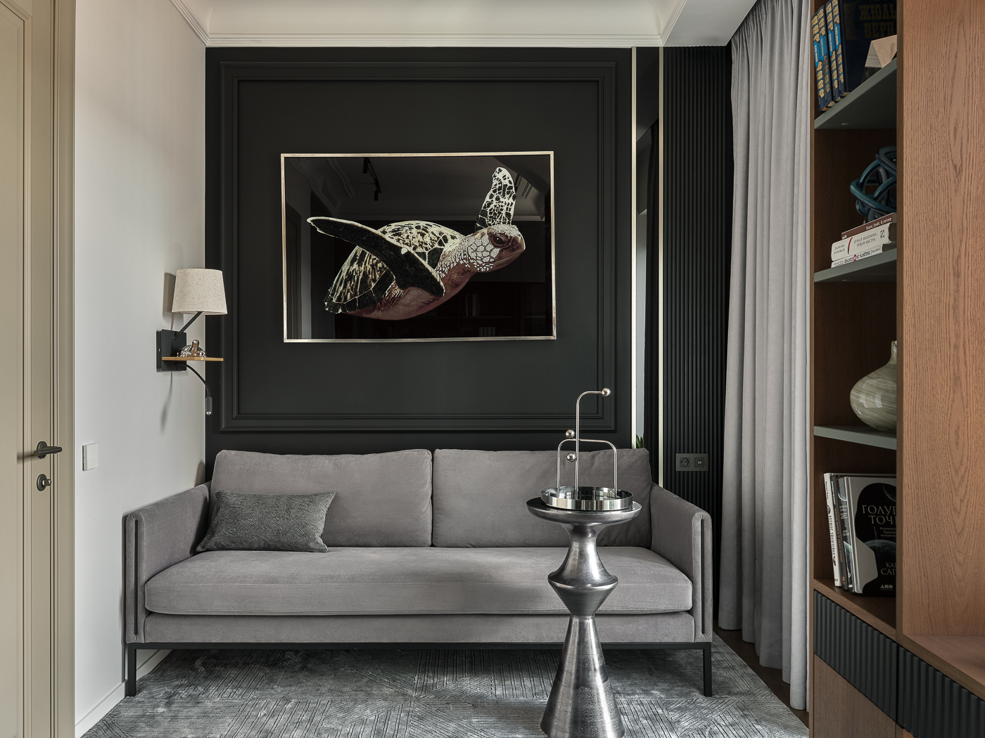 Заказчики коллекционируют фигурки черепах из разных стран — и дизайнер превратил этот личный код в тонкий мотив, который сквозит в интерьере: на зеркале, в графике, в аксессуарах.