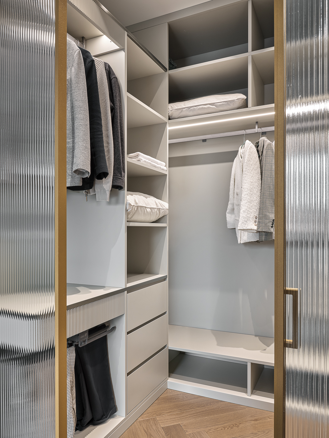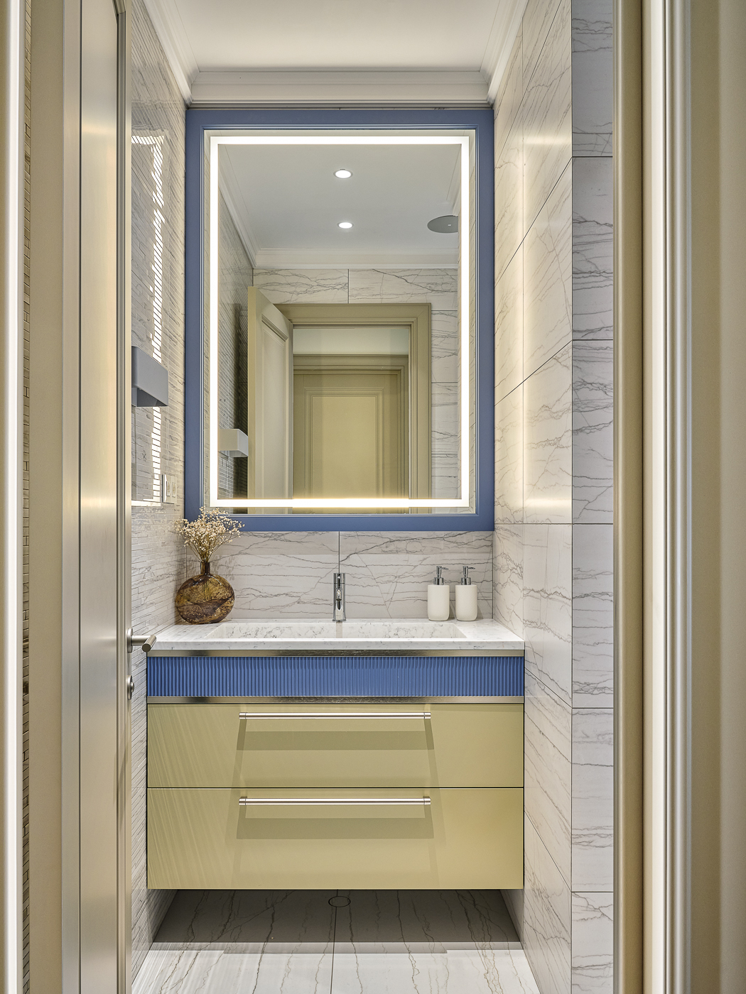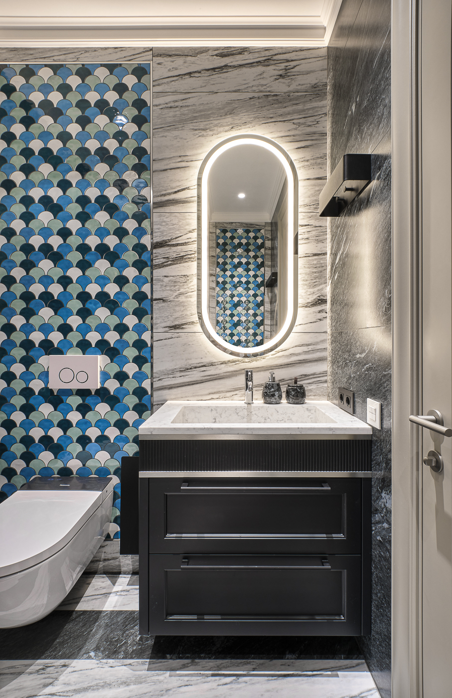 Заказчики коллекционируют фигурки черепах из разных стран — и дизайнер превратил этот личный код в тонкий мотив, который сквозит в интерьере: на зеркале, в графике, в аксессуарах.
