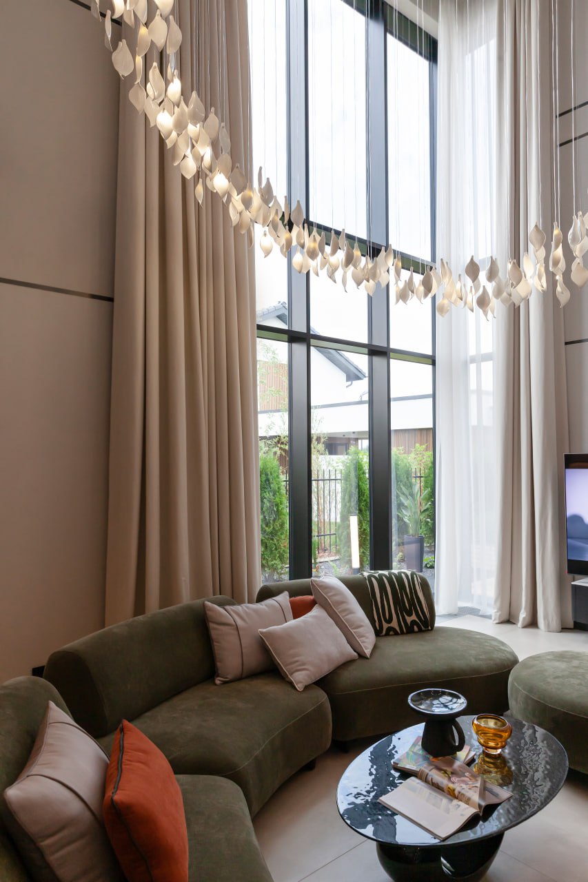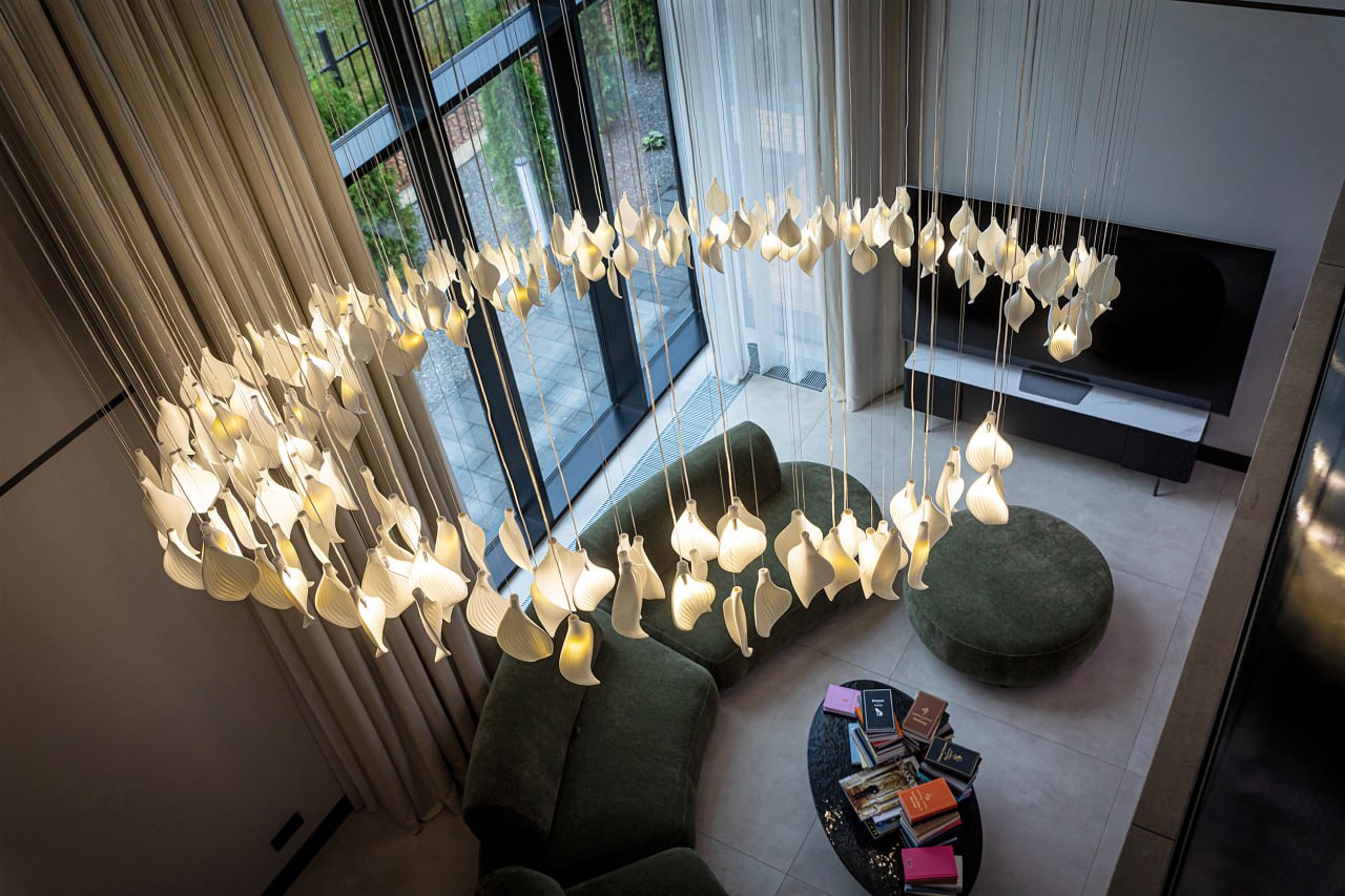 Для проекта дома «Агат» (https://t.me/domforest43/2107) компании «Дом Форест» (https://dom-forest.ru/) мы создали авторскую люстру по задумке дизайнера проекта. Каскад из более чем 200 нежных керамических лепестков молочно-белого цвета, подсвеченных светодиодными лампами, украсил гостиную дома.